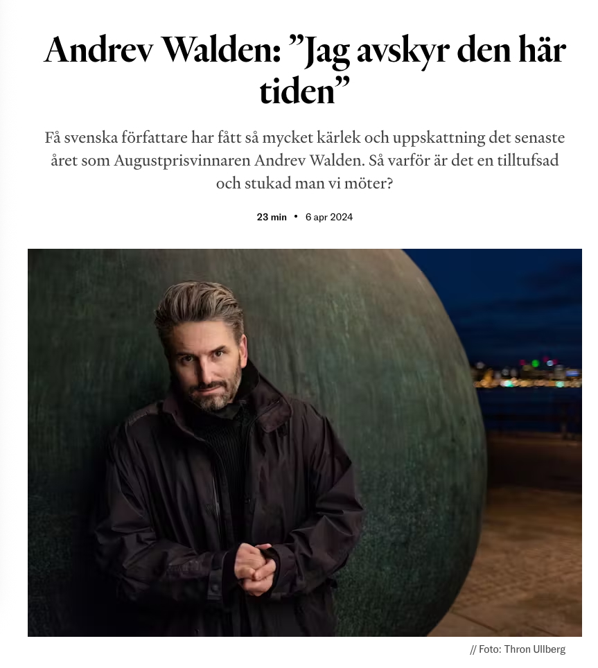 Åsa Linderborg’s interview with Andrev Walden was originally published in Swedish in Vi läser in April 2024, a few months after Walden’s debut novel Jävla karlar was awarded the 2023 August Prize.